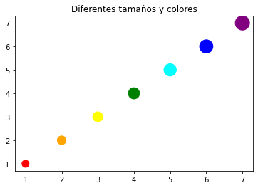 Observación. Podemos dibujar cada punto de un tamaño, pasando una lista al parámetro s, También podemos pintar un punto de cada color, pasando como parámetro c una lista de colores: